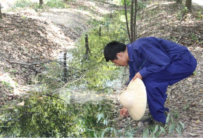 10:50,在81#標志樁附近的小樹林里,溝里的水有些發黑,王師傅仔細查找根源,確定是旁邊的染料廢桶堆積場里流出來的廢水。