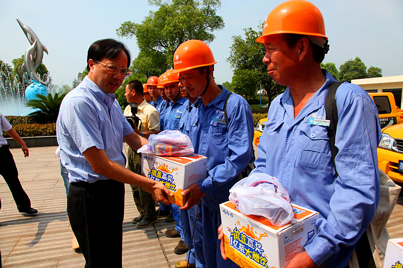 7月12日上午,縣委書記何加順、副縣長周樹森等領(lǐng)導(dǎo)在水務(wù)集團董事長倪阿泉、總經(jīng)理單寶子等領(lǐng)導(dǎo)陪同下來到公司慰問在高溫下作業(yè)的供水一線職工,親手把防暑降溫慰問品送到他們手上,并再三叮囑有關(guān)人員落實好夏季高溫時段的防暑降溫措施,確保一線職工身體健康。