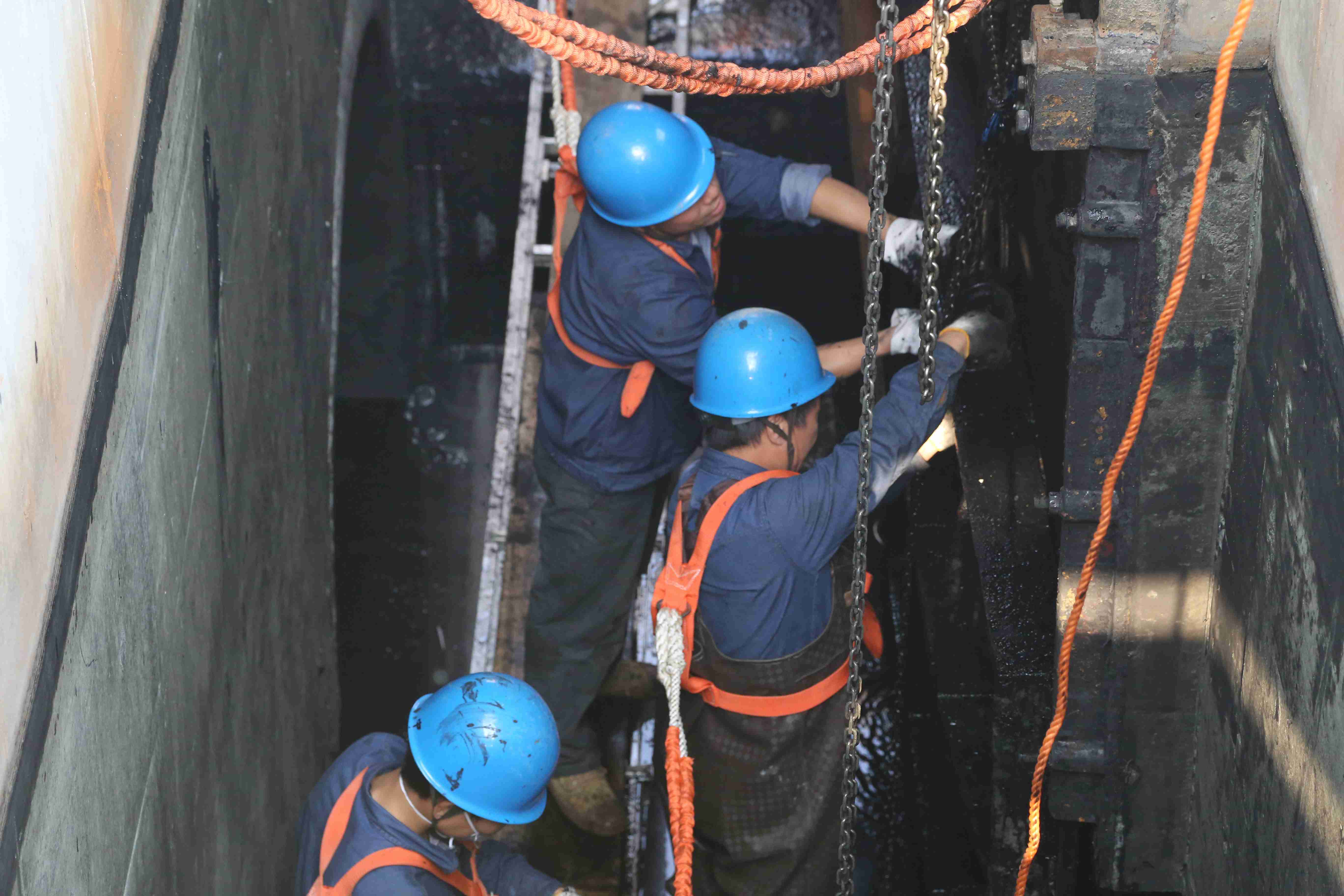 此次維修工作地點(diǎn)全程為混凝池池底,面對(duì)池底污泥層厚、空間狹窄等難題,公司前期組織維修人員、安全員等多次進(jìn)行方案探討并確定3套維修方案;在維修工作進(jìn)行過