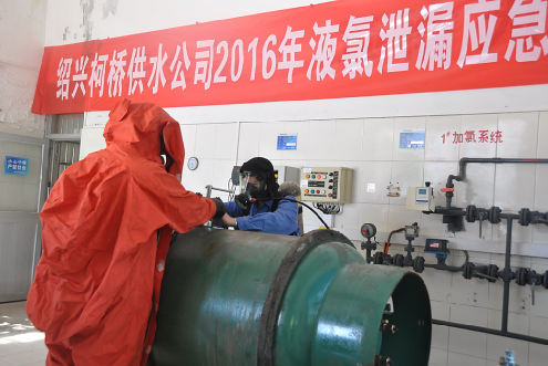 為切實增強(qiáng)對危化品使用的安全意識和應(yīng)急處置能力,6月30日上午,公司在柯橋泵站加氯間舉行了2016年液氯泄漏應(yīng)急演練,共有13名泵站人員參與本次演練。