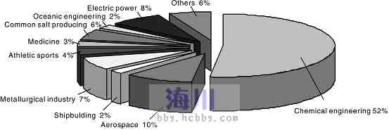 化工系統(tǒng)是中國民用工業(yè)最早使用鈦, 且用量最大的工業(yè)部門。近10年,我國化工行業(yè)用鈦量相當于2009年和2010年兩年鈦材生產量之和。表列出了我國化工各領域用鈦的比例