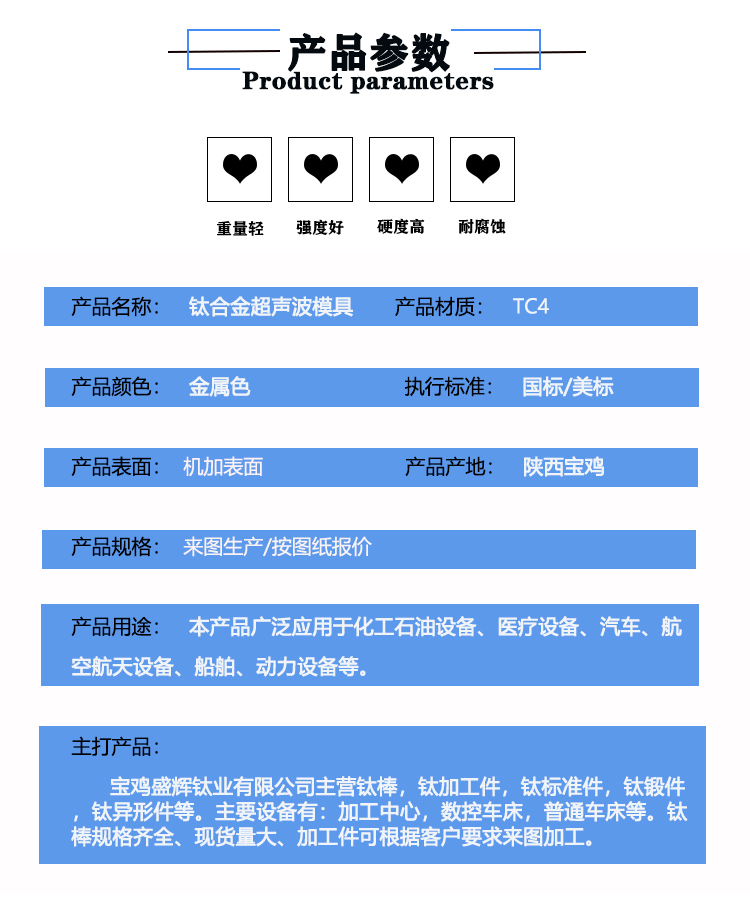 寶雞盛輝鈦業有限公司是一家主要從事鈦及鈦合金棒,鈦環,鈦法蘭及鈦合金板材的高新技術企業,公司提供鈦環,鈦合金棒批發,鈦環的生產工藝服務,以人為本,質量取勝為宗旨:18791863990,18740375975